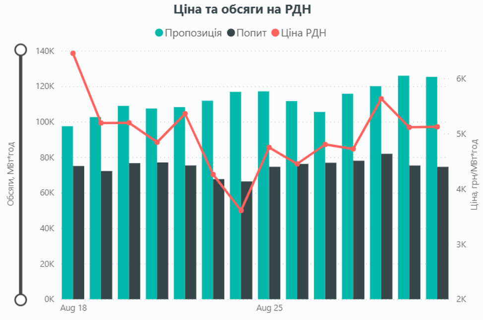 У вихідні (30.08 – 31.08) середня ціна становила 5117,40 грн/МВт·год, що на +30,1% (або на 1184,69 грн/МВт·год) більше порівняно з попередніми вихідними (23.08 – 24.08).