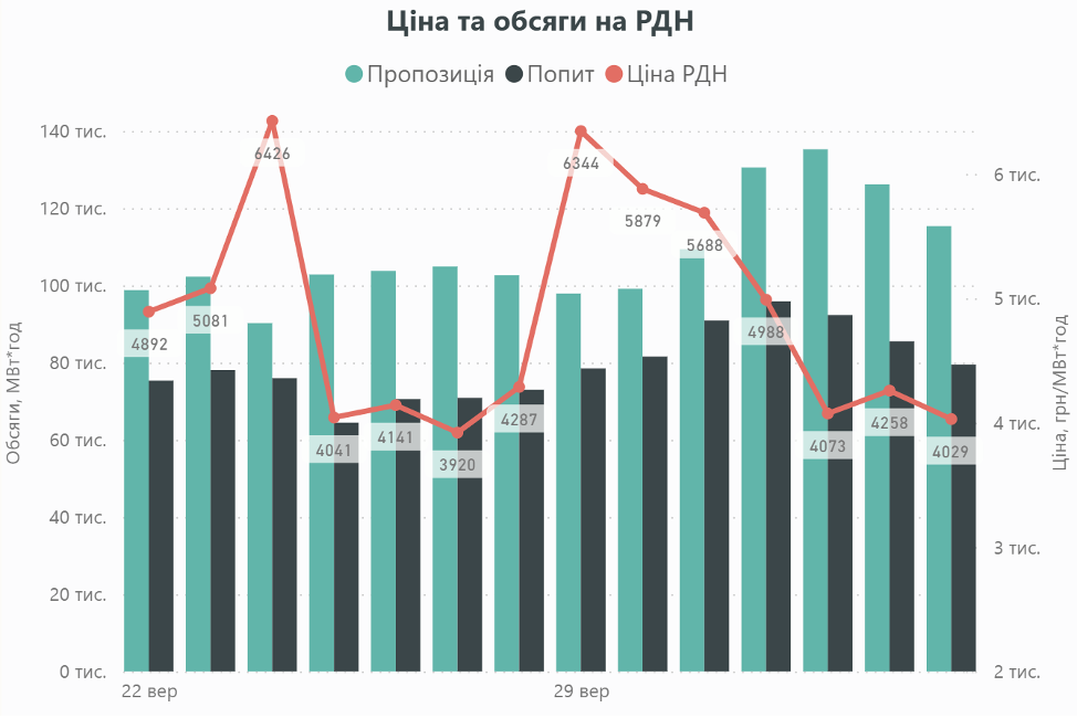 · найдорожчим днем був понеділок (29.09) із середньодобовою ціною 6344,12 грн/МВт·год (+17,6% або +949,58 грн/МВт·год від середнього рівня робочих днів);