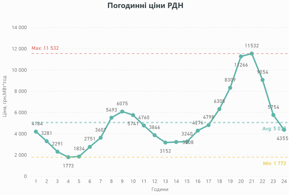 У той же час, варто уникати надмірного споживання електроенергії у вечірні години (17:00-23:00), коли середня ціна сягає 8703,93 грн/МВт·год, та враховувати високий рівень цін у ранкові години (06:00-10:00) – 5229,03 грн/МВт·год.