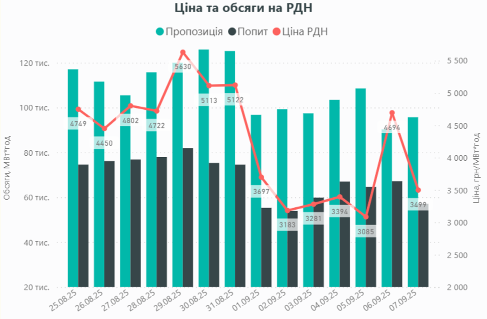 · найдешевшим робочим днем була п’ятниця (05.09) із середньодобовою ціною 3084,83 грн/МВт·год (-7,3% або -243,19 грн/МВт·год від середнього рівня робочих днів).