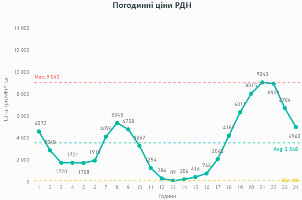 У той же час, варто уникати надмірного споживання електроенергії у вечірні години (17:00-23:00), коли середня ціна сягає 7197,72 грн/МВт·год, та враховувати високий рівень цін у ранкові години (06:00-10:00) – 4366,39 грн/МВт·год.