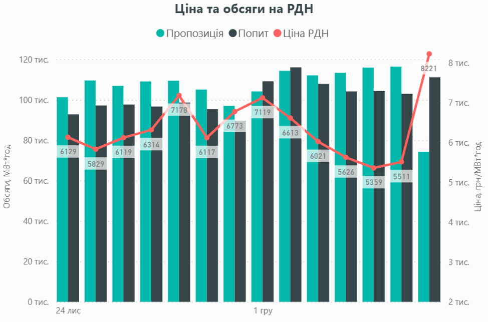 · найдешевшим робочим днем була п’ятниця (01.12) із середньодобовою ціною 5359,00 грн/МВт·год (-12,8% або -788,63 грн/МВт·год від середнього рівня робочих днів).