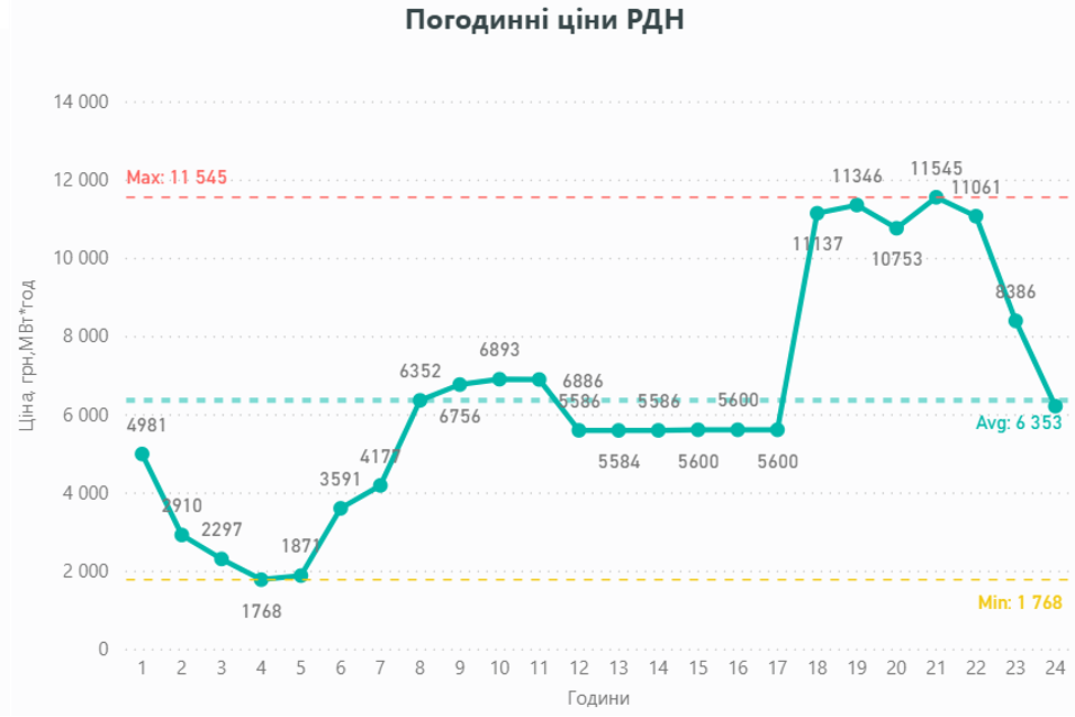 З огляду на цінову динаміку минулого тижня, бізнес-споживачам рекомендується оптимізувати графіки енергоспоживання. Найнижчі ціни були зафіксовані в денні години (10:00-17:00) – середньотижнева ціна становила 5777,24 грн/МВт·год, у нічні години (23:00-06:00) – 3374,51 грн/МВт·год, а також у ранкові години (06:00-10:00) – 6044,46 грн/МВт·год.