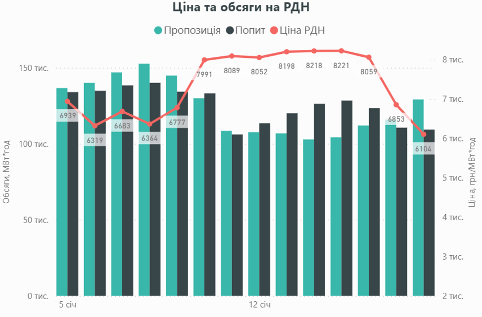 · найдорожчим днем був чеьвер (15.01) із середньодобовою ціною 8220,83 грн/МВт·год (+0,9% або +71,28 грн/МВт·год від середнього рівня робочих днів);