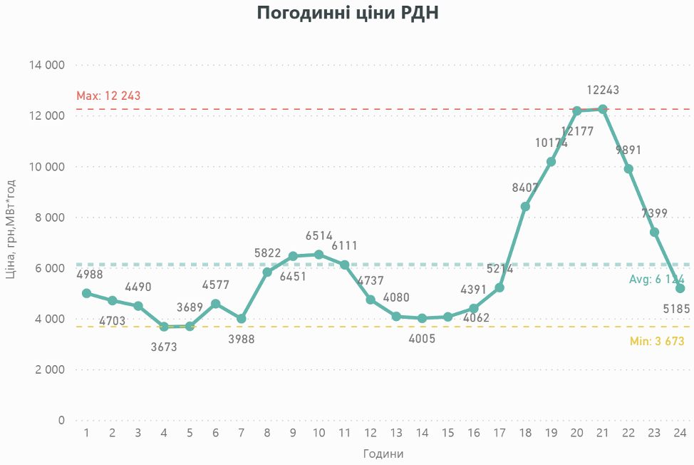 У той же час, варто уникати надмірного споживання електроенергії у вечірні години (17:00-23:00), коли середня ціна сягає 10048,62 грн/МВт·год, та враховувати високий рівень цін у ранкові години (06:00-10:00) – 5694,05 грн/МВт·год.