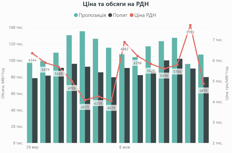 · найдорожчим днем був понеділок (06.10) із середньодобовою ціною 6882,11 грн/МВт·год (+13,6% або +823,2 грн/МВт·год від середнього рівня робочих днів);